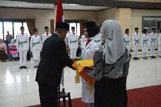 Selanjutnya, Wakil Wali Kota membacakan pernyataan pengukuhan sekaligus melakukan pemasangan kendit secara simbolis sebagai tanda resmi pengukuhan calon anggota paskibraka kepada Fathiya Adhwa selaku pemimpin upacara.