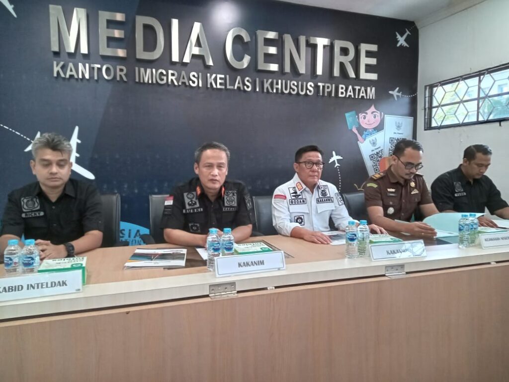 Dalam konfrensi Pers yang dilaksanakan di ruang Media Center Kantor Imigrasi Kelas I TPI Batam, Rabu (21/6/2023), Kepala Kantor Wilayah Kemenkumham Kepri, Saffar Muhammad Godam, dampingi Kepala Kantor Imigrasi Kelas I TPI Batam, Subki Miuldi.