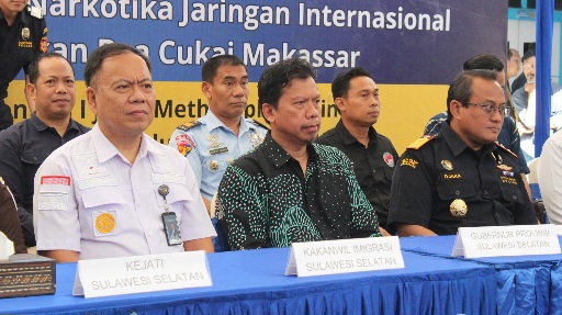 QAYYUMNEWS.ID, Jakarta – Kepala Kantor Wilayah Ditjen Imigrasi Sulsel Friece Sumolang turut menghadiri kegiatan Press Release Pengungkapan Kasus Narkotika Jaringan Internasional,KPPBC TMP B Makassar, di Jl. Hatta No.2, Kompleks Pelabuhan Utama Soekarno-Hatta Makassar, Sabtu (21/6/2025).